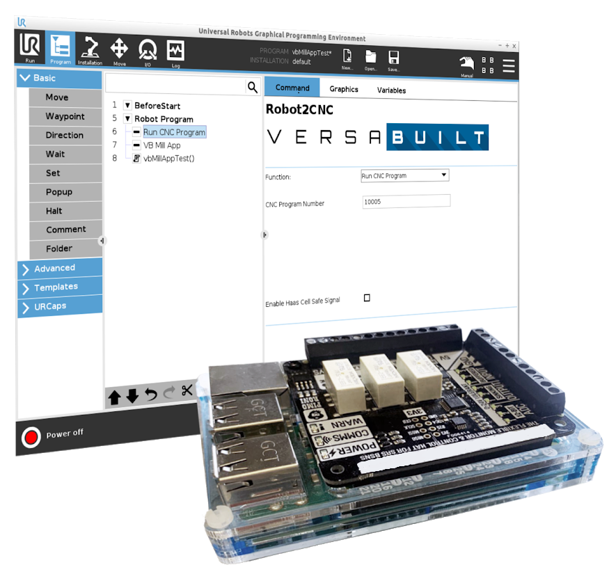 Robot2CNC is a small industrial computer that sits inside your CNC's control cabinet and provides a ethernet control interface for any robot that has ethernet TCP/IP support. The Robot2CNC interface is simple and remains the same for all supported CNCs. For Universal Robots, programming is greatly simplified with the included URCap. Other brands of robots can use Robot2CNC by making a TCP/IP connection to the robot and issuing simple text-based commands. By allowing the robot to select the CNC program number within the automation, both robot and CNC programming are simplified and the chance for expensive operator errors during change over are reduced.